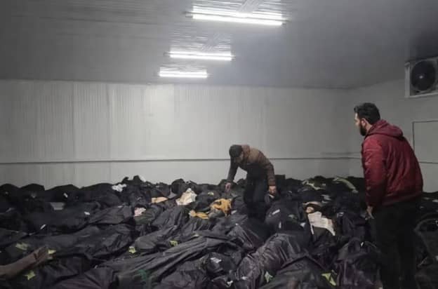 Men stand amid rows of corpses in a morgue in Tehran following mass killings of protestors by security forces (Iran International)