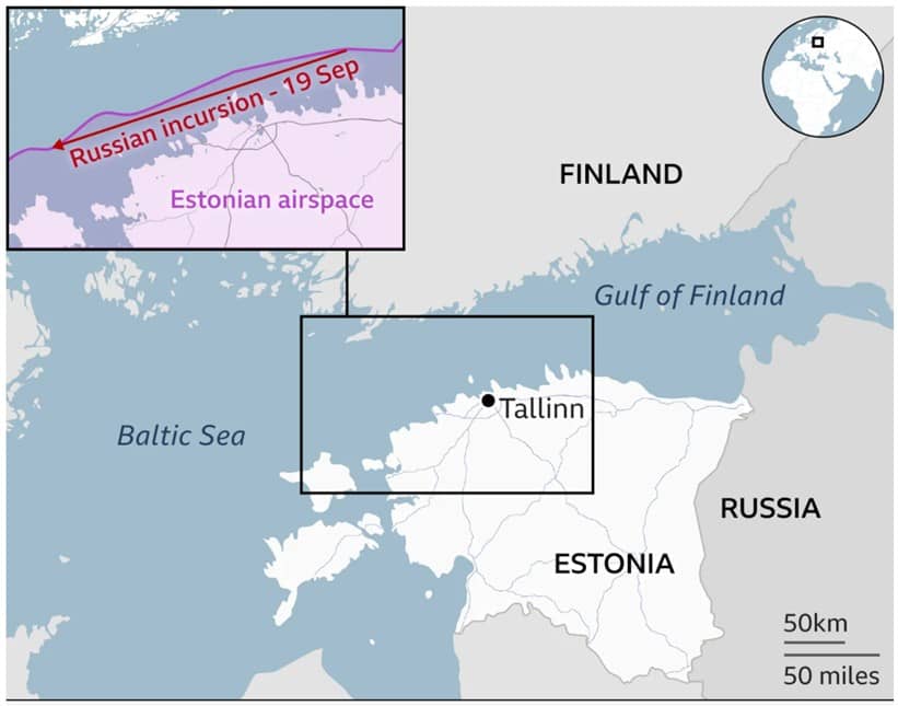 In breaking news, on September 19th, Russian aircraft violated Estonian airspace. Thet Estonian government reported that three Russian MiG-31 fighter jets entered Estonian airspace without permission over the Gulf of Finland and remained for over 10 minutes. NATO scrambled jet interceptors as a precaution, and Estonia has requested NATO Article 4 protection of its skies.