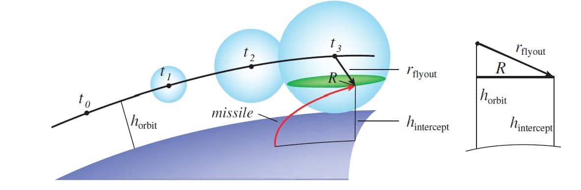 T3 – The kill zone and flyout range of the interceptor converge at a range for the satellite ‘R’ based on the flyout range (rflyout) and the height of the Intercept