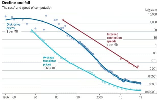 The decline in cost per transistor, internet connection speed, and data storage (John McCallum)