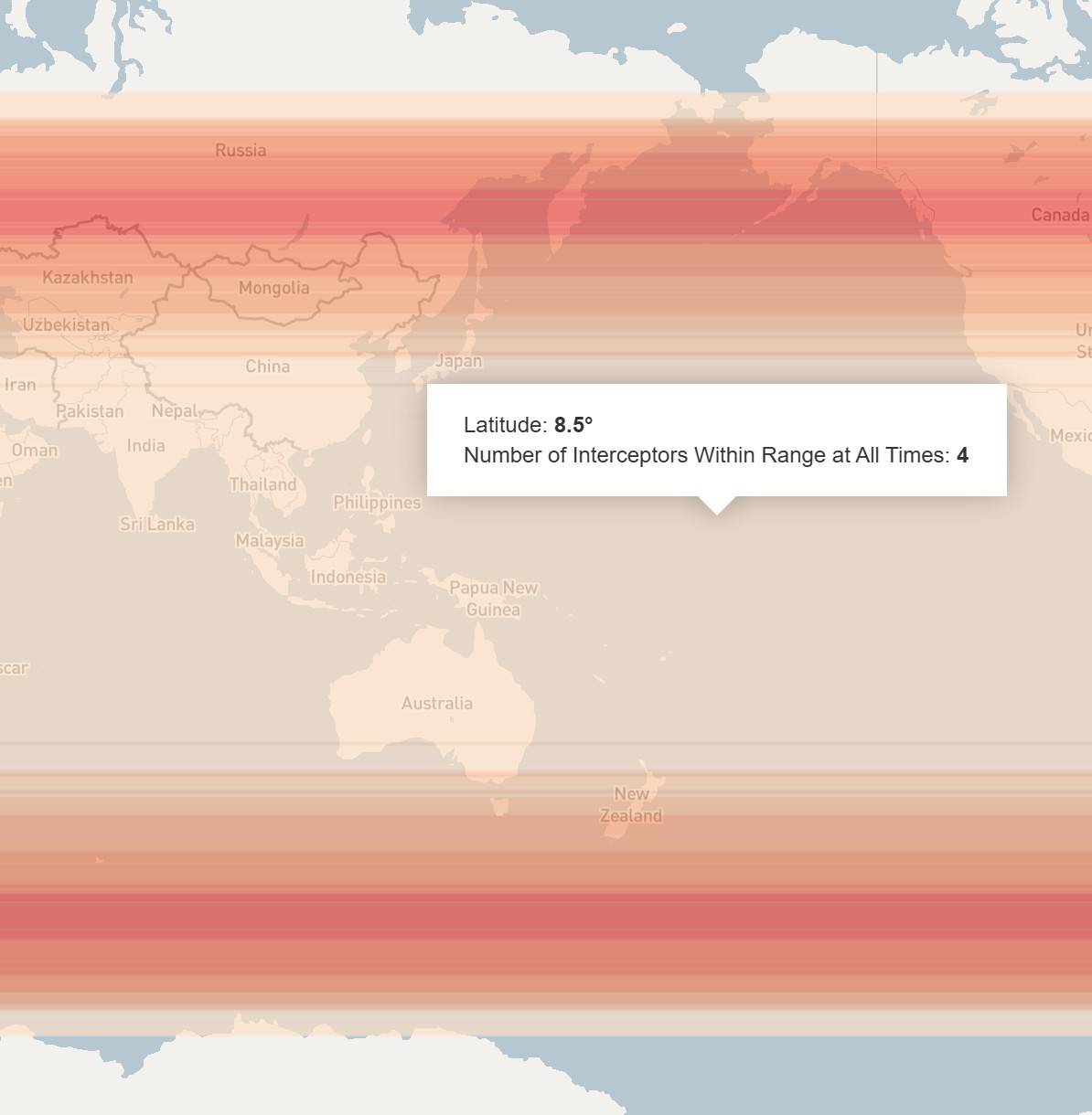 The DoD has not released specific system specifications for Golden Dome – but when they are, I’ll devote a Dystopic Newsletter to what unclassified details are released. However, the Center for Strategic and International Studies (CSIS) published an in-depth analysis and simulation that describes the minimum number of interceptors within range of a missile launched from any location on Earth. The simulation is based on a limited set of space-based interceptor constellation parameters to limit simulation complexity: