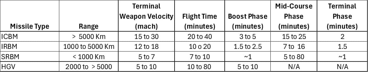 Flight parameters of ballistic missiles ( ICBM, IRBM, & SRBM) and Hypervelocity Glide Vehicle (HVG) – Note: Mach 1 = 761.2 MPH (MPH) or 1225.1 KPH (kilometers per hour)