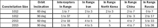 I have chosen two constellation configurations that optimise the number of intercepts across the four major countries that are a threat: Russia, China, North Korea, and a nuclear-armed Iran. The results are listed below: