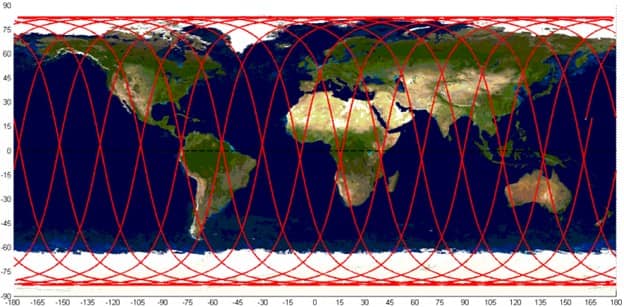 As a satellite orbits on its given inclination, it creates a ground track that shifts across the Earth. For LEO orbits, a single track is between 90 minutes and 2 hours, resulting in 12 to 16 tracks across the Earth in a 24-hour period. A satellite in an 85-degree inclination orbit and the associated 24-hour ground track are shown in the following diagrams.