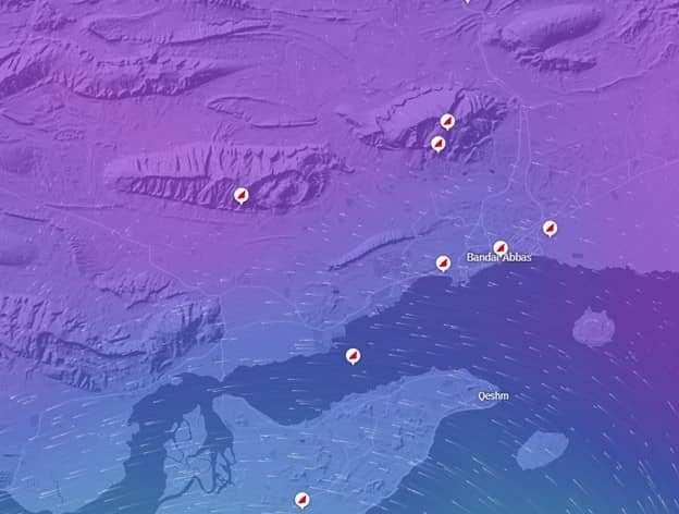 Wind map of the area surrounding Bandar Abbas, Iran (Windfinder)