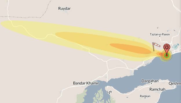The fallout contour extends down range from Bander Abbas 81 miles, with the heaviest fallout for a distance of 30 miles with a maxium width of 3 miles. NukeMap can only model a surface burst for fallout effects. While the area of fallout, which is principally a function of local wind and wind direction, would be the same the fallout radiation levels would be significantly lower.