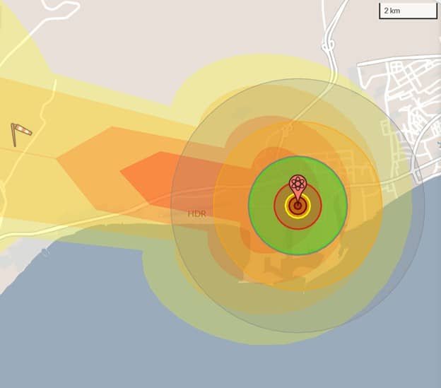 To get a feel for the destructive power of the W61-12, we turn to the Nuke Map simulator developed by Alex Wellerstein and Windfinder to determine the direction and extent of fallout from an attack on the Iranian missile development center located at the port of Bandar Abbas .