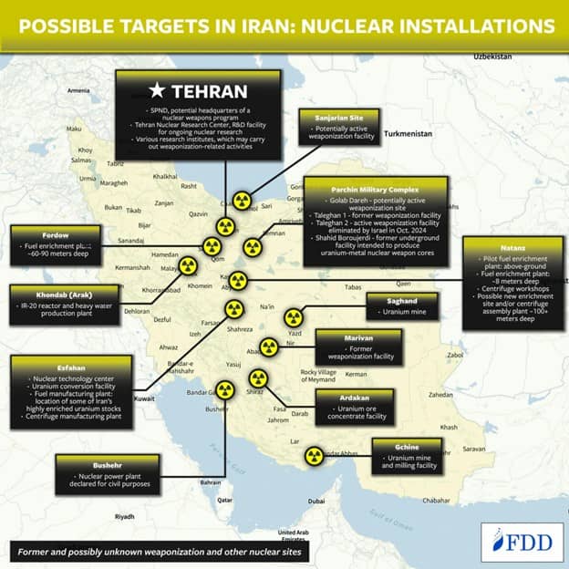The Foundation for Defense of Democracies (FDD) publishes an interactive map of nuclear, military, and regime infrastructure targets that have been targeted and attacked during Operation Epic Fury. Specific nuclear targets are shown from the FDD interactive map.
