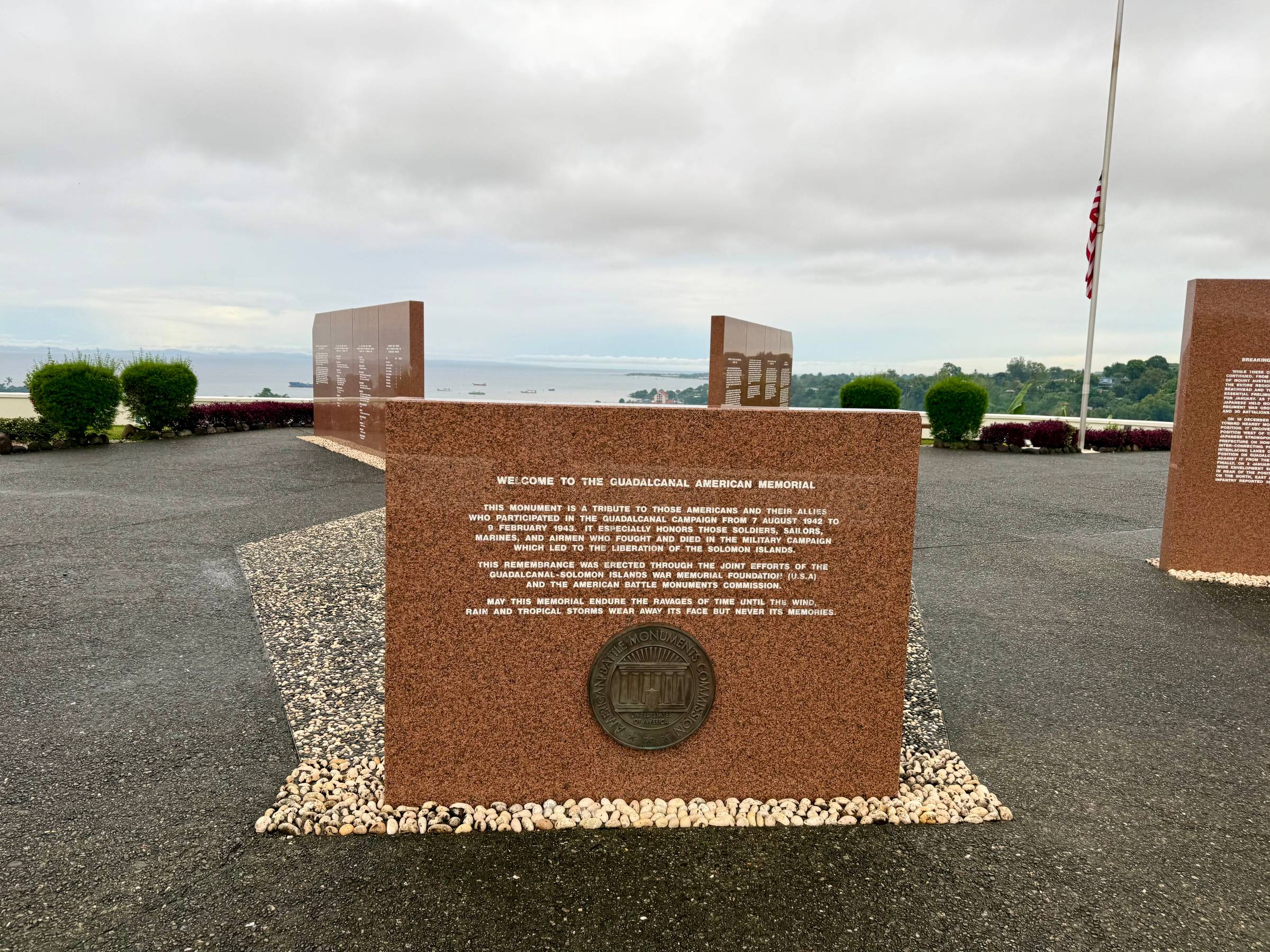 Our tour ended with a stop at the US Guadalcanal Memorial. A series of giant pink granite monoliths set at the top of a bluff overlooking Honiara Harbor, Iron Bottom Sound, and Savo Island. Each of the monoliths was inscribed with descriptions of the naval and marine battles that took place from August through November of 1942. One set of monoliths tallied the lost and damaged ships and the number of combatants killed in action in the campaign.