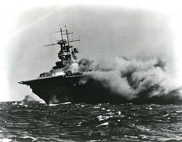 USS WASP CV-7 hit by 3 Torpedoes fired by Japanese Submarine I-19