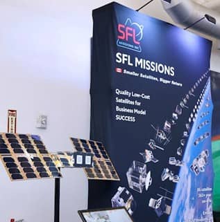 Small Satellite Manufacturer SFL Missions booth with NEMO small satellite platform at SVSW (P. Struhsaker)
