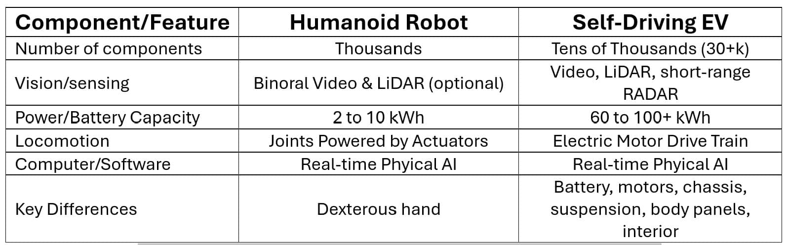 Self-driving EVs are designed to carry human passengers safely for hundreds of miles. EVs need powerful batteries and electric motor drive trains to achieve this goal. Humanoid robots use joited limbs powered by actuators for movement and dextrous hands with a focus on fine control and positioning. Unlike robots, cars have thousands of parts designed to carry and protect human passengers and cargo weighing 1000 lbs or more. Robots can carry themselves and roughly 100 to 200 pounds of baggage ( lift capacity) over short distances. That's where the differences end.